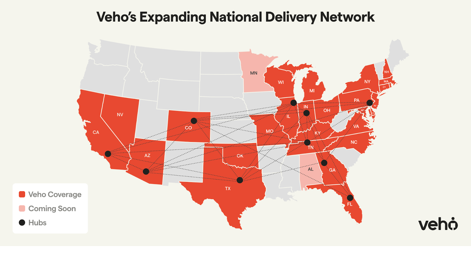 Amid an environment in which legacy delivery carriers are pulling back from e-commerce, raising rates and reducing capacity, Veho has increased its coverage by 50% year-over year, growing from 44 markets primarily in the east and midwest to–today–66 markets from coast-to-coast. As a result, Veho now reaches 144 million Americans, or 44% of the U.S. population. Alongside new markets in Phoenix and Scottsdale, Arizona; Las Vegas, Nevada; San Diego, California; Allentown, Pennsylvania; and Athens, Georgia, Veho also now covers all of the Los Angeles metropolitan area, following its initial launch in the fall.